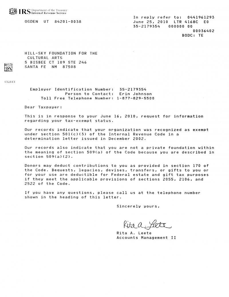Hill-Sky Foundation is a New Mexico 501(c)(3) charitable organization. See our IRS status letter below: